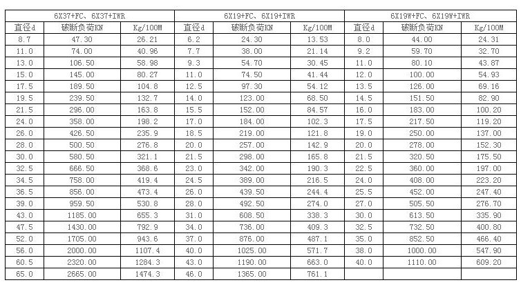 2、破斷負荷為纖維芯FC鋼絲破斷拉力總和,金屬芯IWR鋼絲破斷拉力總和≈纖維芯的1.08倍,鋼絲破斷拉力總和=鋼絲繩最小破斷拉力X1.283。